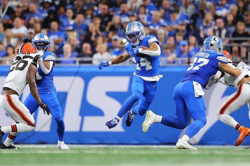DETROIT.- Jared Goff lanzó dos pases de touchdown a Amon-Ra St. Brown, Kalif Raymond devolvió un despeje 65 yardas para otra anotación y los Leones de Detroit vencieron 34-10 a los Browns de Cleveland.