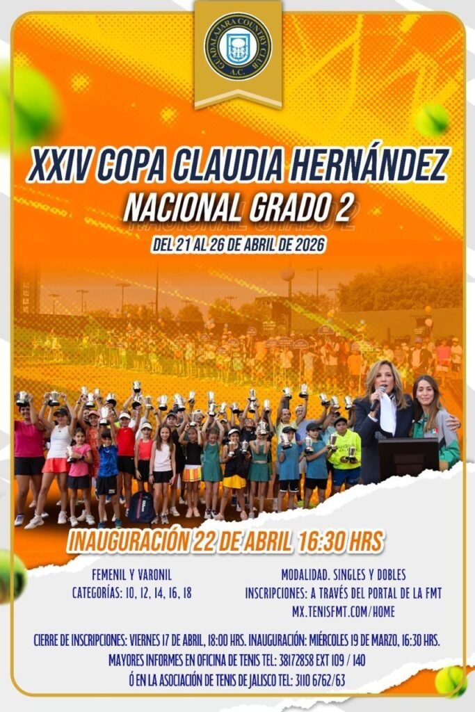 GUADALAJARA, JALISCO, 21 de abril de 2026.- Todo está listo para el inicio de la XXVI Copa de Tenis Claudia Hernández, que se realizará del 21 al 26 de abril en las canchas del Guadalajara Country Club, como tradicionalmente se hace, y que, avalada por la Federación Mexicana de Tenis es actualmente considerada como Campeonato Nacional Grado 2, el cual contará con la participación de tenistas en las categorías de 10, 12, 14, 16 y 18 años, en ambas ramas y en las modalidades individual y dobles.